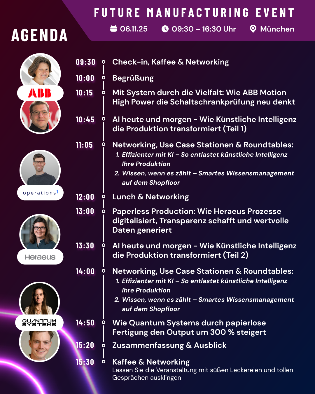 Das Future Manufacturing Event ist keine theoretische Konferenz, sondern eine praxisorientierte Veranstaltung. Führende Unternehmen wie ABB, Heraeus und Quantum Systems zeigen, wie sie digitale Lösungen und Künstliche Intelligenz bereits heute in der Produktion erfolgreich einsetzen.