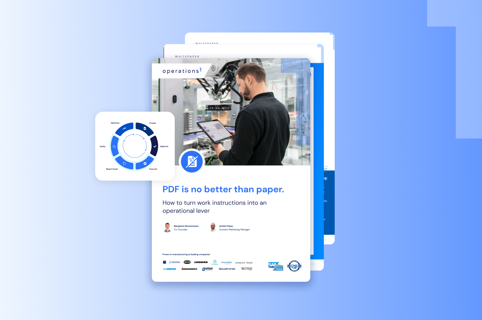 PDFs in the DMS, printouts on the line, tribal knowledge in the shift lead's head: many plants believe they are digitized. In practice, this leads to search times, variant errors, and incomplete audit trails. This whitepaper shows how manufacturers move from static documents to guided, digital work instructions, what role AI plays in the process, and how to get started with a focused pilot. Featuring real-world examples from companies like KraussMaffei, Oetiker, POLIPOL, and Quantum Systems.